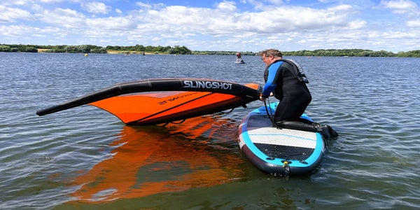 Wingfoiling - .the latest fascinating sport on the water. Holding a wing type sail to power you forward, and with a hydrofoil below the board, in relatively low wind (about 12 mph) you are soon floating above the water's surface, gliding silently and effortlessly in all directions.